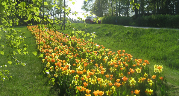 Maskinplanterad blomsterlök lyser upp väg nära Åkersberga.
