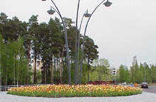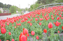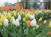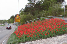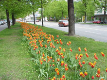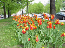 på söder i Stockholm. Gul/röda liljeblommande 'Fly away' och den lite kortare, kraftiga triumftulpanen 'Kees Nelis' blev stadsdelsförvaltningens val till den mycket uppskattade planteringen. . |