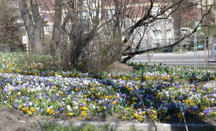 lever huvudstaden upp. I de speciella bronskärlen runt dammen har man följt upp trädens blomning med färgmässigt matchande blomsterlöksblandningar - här Verver 'Parfum des Vosges'. Klicka på bild för förstoring och fakta. |
