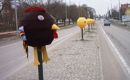 med att sprida glädje och trivsel med härliga blomster- arrangemang. Under vinterhalvåret använder man sig bland annat av Blomträdens stomme för att skapa installationer som värmer frusna själar och piggar upp i väntan på vårens och sommarens värme. Ovan dekoration julen 2003 och nedan installation inför påsken 2004. |