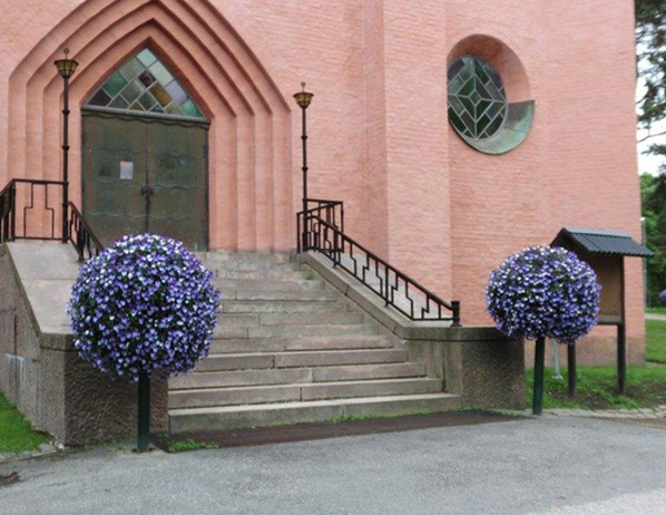 blickfång - med mycket lång blomstersäsong. Blomträden vårplanteras med penséer och ställs ut redan i mitten av mars, för att i början/mitten av juni omplanteras med Sufinia som står fram till mitten av oktober. Driftansvarig Arne Elg vid Sandvikens kyrkogårdsförvaltning framhåller att skötseln inskränker sig till påfyllning av vatten en gång per vecka. Ovanstående bild, som tagits i mitten av juni 2013, visar Blomträd, planterade vardera med ca 80 st. Surfinia, blå och vita. Utöver totalt 10 st Blomträd har kyrkogårdsförvaltningen 8 st MPS Kub som staplats till 4 st effektfulla blompelare. . |
