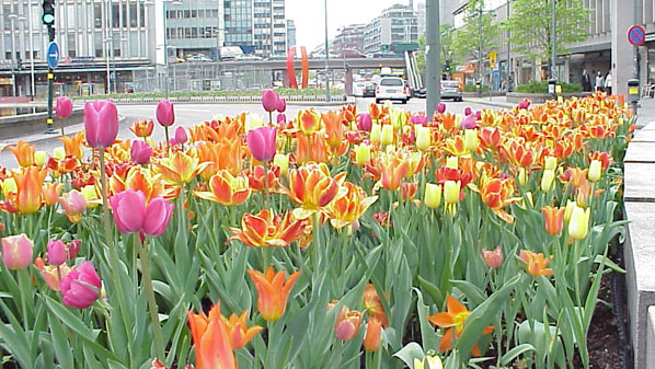 Närbild tulpanarrangemang mot Sveavägen, Stockholm.