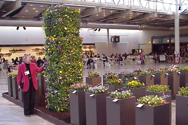 möttes besökarna av härligt vårblommande penséer. Denna drygt 2,5 meter höga blomsterpelaren tilldrog sig stort intresse. Den är uppbyggd av 4 st växtmodul MPS Kub Vid vertikal vårplantering rekommenderar Weibulls expertis pensé- sorter med kompakt, krypande växtsätt. Se fler exempel på olika vertikala planteringar på bland annat Blomåret 2004 och Växtmoduler. . |